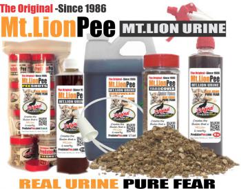 Mt.Lion Urine also known as Cougar Urine is an all-natural alternative to toxic repellents for armadillos, javelinas, wild boar, and wild pigs. It's safe to use around pets and contains no chemicals. Cougar pee works as a highly effective territorial deception scent, tricking these animals into thinking their most dangerous predator is ready to strike.