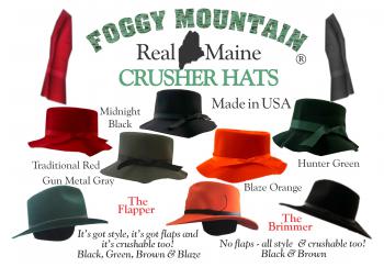 It's going on 25 years since we first revived the classic Maine Crusher Hat. It's been very rewarding to hear from people, many with long-time Maine connections, enjoying our hats. The Foggy Mountain® Maine Crusher Hat is a simple waterproof, crushable hat that is just so incredibly practical. Just fold it up in your pocket or purse and pull it out when you need it. Foggy Mountain® Maine Crusher Hats also carry with them a distintive fashion statement of rugged, understated confidence. In recent years, we added several new colors and two new styles with more of a "goin' to town" feel to them. The first is the Foggy Mountain®- the first and only wool crusher hat in a modified western style with ear flaps for winter comfort. Flaps up or flaps down, this waterproof and crushable hat brings winter style and comfort to a whole new level. The other is the Foggy Mountain® Brimmer which brings the same style and comfort as the Foggy Mountain® Flapper - just without the flaps!